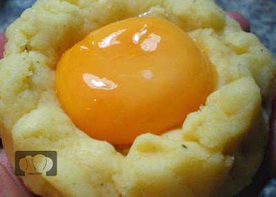 Cubrimos con otra media esfera de puré, con lo que nos quedarán pelotas de puré rellenas de yema de huevo. Pasamos por las claras batidas que nos separamos anteriormente de las yemas.