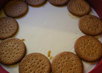 Remojamos en café unas galletas -las nuestras eran hojaldradas- y las colocamos sobre la panacota.