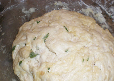 Incorporamos el romero y la salvia a la masa y dejemos esta reposar en el mismo cuenco tapada con un paño -30 minutos aproximadamente-.
