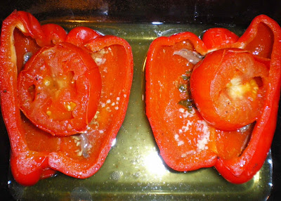 Los tomates cortados por la mitad los ponemos dentro del pimiento y los sazonamos y los ponemos por arriba un chorrito de aceite. -Mejora el plato un 100 por 100 escaldar un momento el tomate en agua hirviendo y pelarlo antes de ponerlo dentro del pimiento-.