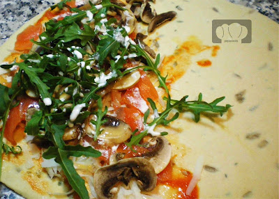 Preparamos una masa de pizza como en la receta anterior (ver enlace). En este caso no está especiada. Simplemente hemos añadido unas semillas de girasol en la masa para que tuviera un toque crujiente.