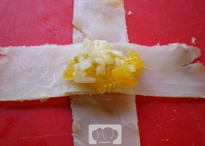 Colocamos dos tiras de bacalao cual bandera de Suiza y en el centro pondremos una cucharadita del relleno.