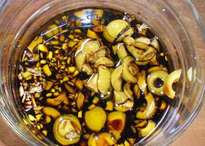 En un cuenco ponemos un chorro del vinagre, otro de salsa de soja y otro más de aceite. Incorporamos el ajo y aceitunas y mezclamos bien.