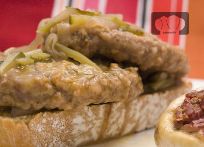 Comenzamos preparando la salsa. Cortamos en juliana la cebolla y los pepinillos. Rehogamos la cebolla y cuando empiece a transparentar agregamos lo pepinillos. Seguimos rehogando un poco más y añadimos una cucharada de harina. Removemos.