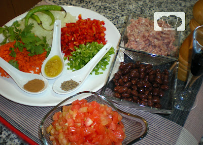 Todas la verduras picadas, como en la foto de los ingredientes, las rehogamos junto a las especias y un poco de aceite de oliva. Incorporamos la carne picada y seguimos rehogando hasta que esté suelta.