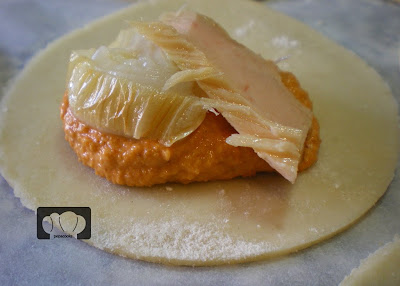 Extendemos la masa de empanadillas muy fina y cortamos las obleas. En el centro ponemos una cucharada de romescu, un pedazo de cebolla asada y un trozo de bonito del norte (¿Hemos dicho Serrats?).