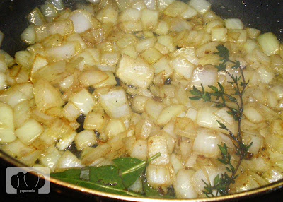Aprovechando ese aceite rehogamos la cebolla junto al laurel y el tomillo. Cuando se transparente, como hijo de cristalero, iremos incorporando las setas y el tomate. Dejamos rehogar el conjunto unos cinco minutos.