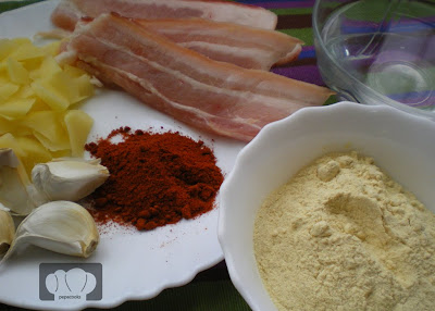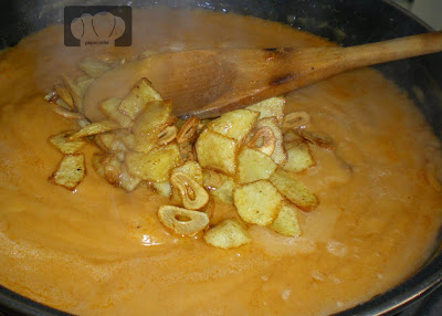 Al final añadimos los ajos y las patatas fritas, un poco de cayena y salamos al gusto. Además se pueden cortar unos trocitos de panceta y añadirlos.
