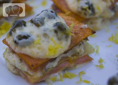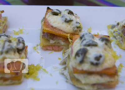 Colocamos como base una capa de patata. Cubrimos con un poco de salsa de mayonesa y alcaparras, cubrimos con salmón y patata, más mayonesa y salmón y terminamos con una capa de batata. Cubrimos con una poco más de salsa por encima.