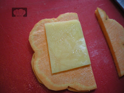Cortamos láminas de patata y batata, todas iguales, unos 3×5 centímetros.