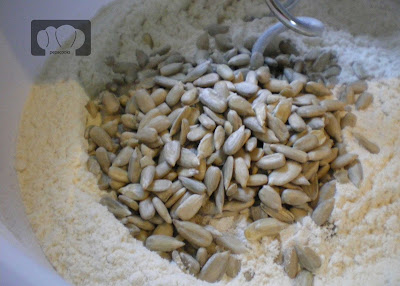 Lo primero que hacemos es disolver la levadura en agua templada. En un cuenco tendremos mezcladas la harina, la sal y las pipas. Hacemos un volcán en el medio y ponemos la masa madre.