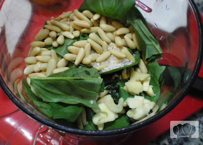 · Pesto (Albahaca, aceite, sal gorda, piñones y queso parmesano – nosotros Grana-Padano – y una pizca de ajo)