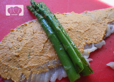 Dos. Enrollamos el rodaballo alrededor de unos espárragos verdes que previamente lo hemos pasado por la plancha. Los colocamos en una fuente de horno.