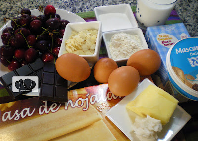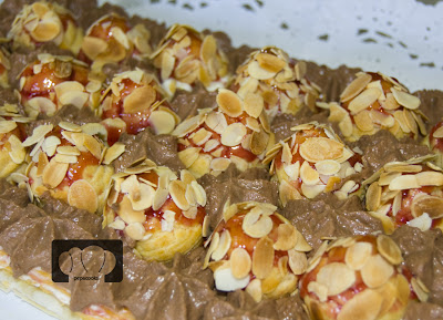 El pastel como tal, lo habíamos llamado Saint Honoré con mousse chocolate y crema de mascarpone al caramelo de cerezas con almendra tostada, pero nos han llamado los de blogger diciendo que no cabía en la cabecera del post y que si podíamos cambiarlo. Como somos así de majos, hemos accedido y lo hemos dejado en el objetivo de la receta que era preparar una tarta Saint Honoré.