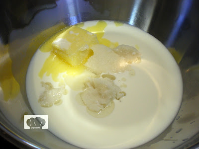 Ponemos a hervir la leche junto a la mantequilla y el azúcar. Cuando empiece el hervor, añadimos la harina de golpe y movemos bien hasta que la masa se desprenda del cazo.